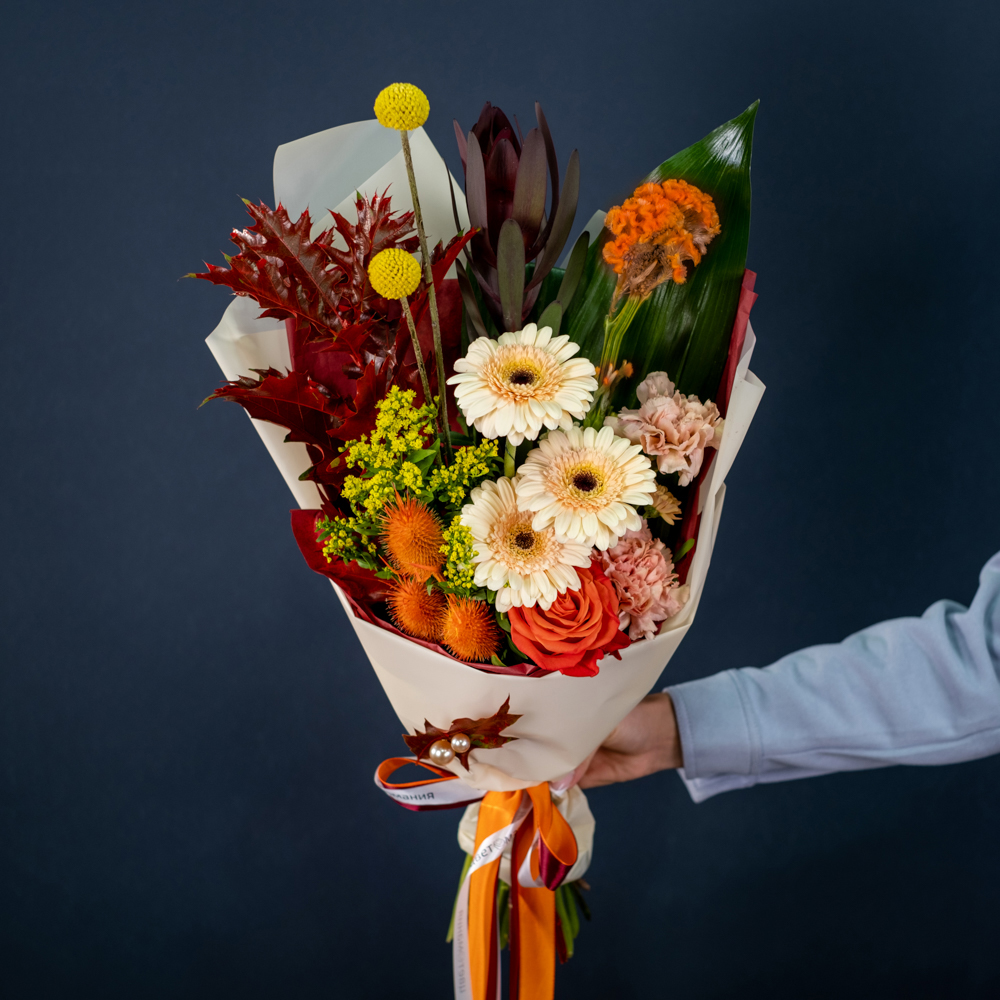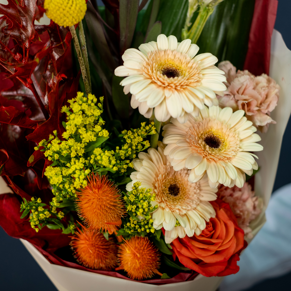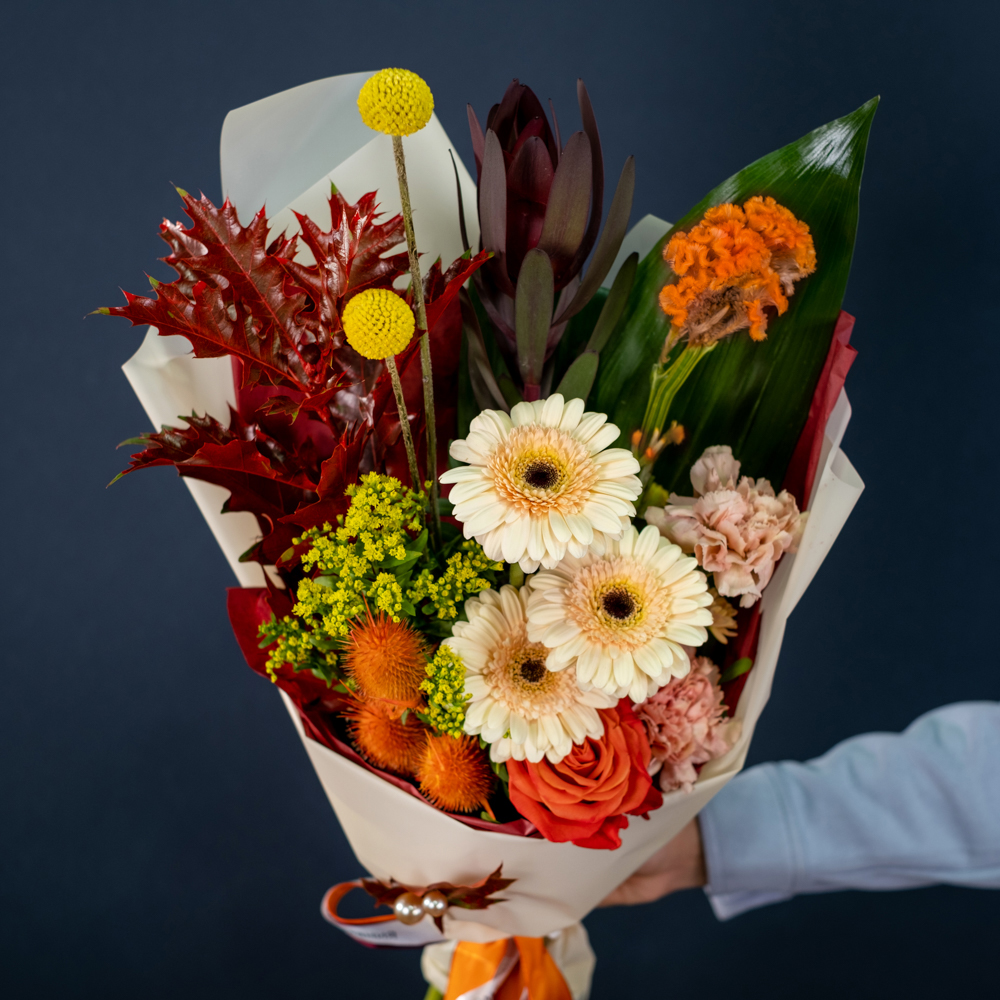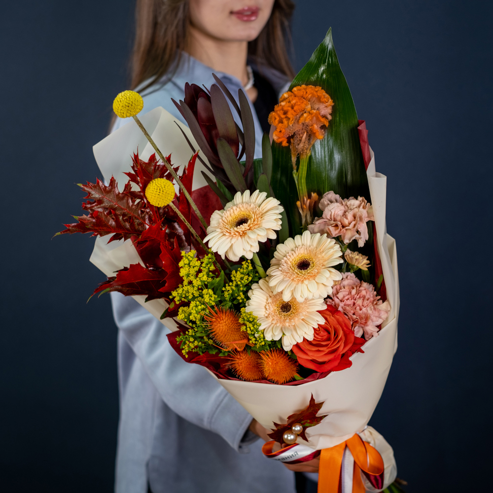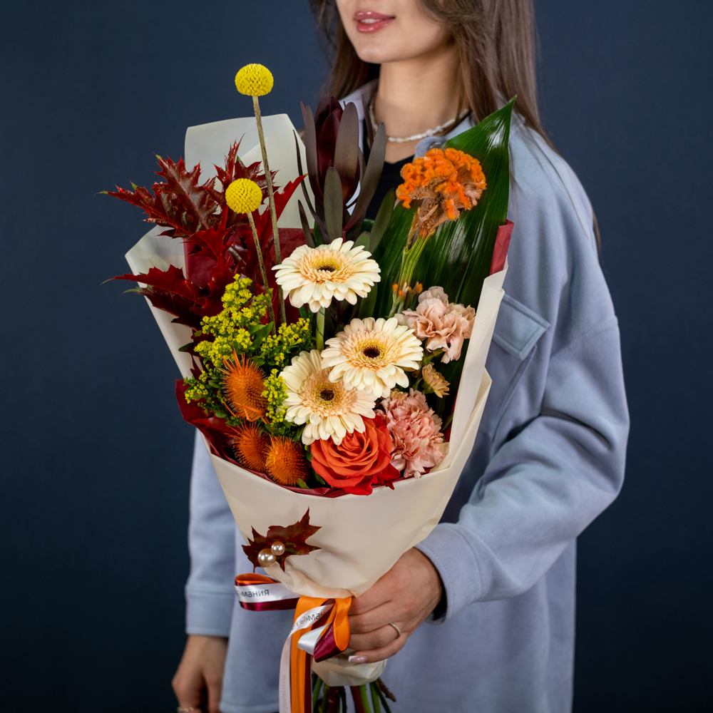 роза эквадор 50 см 5, гербера мини 4, сантини 4, кустовая роза 2, гвоздика 4, кверкус 2, целлозия 3, солидаго 3, аспидистра 3, пистач 2, эвкалипт стабилизированный 2, брошь, упаковка, лента, аквабокс, сумочка